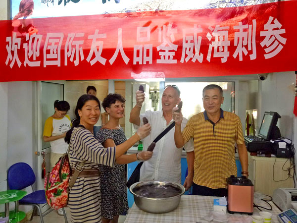 “歡迎大家的光臨!”李雙舉上前同嘉賓一一握手。隨后,嘉賓們饒有興趣地參觀了威海刺參,并品嘗了用地道威海刺參現(xiàn)磨現(xiàn)打的“海參液”?!斑@味道太鮮美啦,可真好哈的!”令人沒有想到的是,默瑞德先生竟然現(xiàn)場用標準的威海方言如此感嘆道。原來,他從2004年開始,每年都來威海推廣中英武術(shù)交流活動,早就屬于“基本標準的威海人”了。