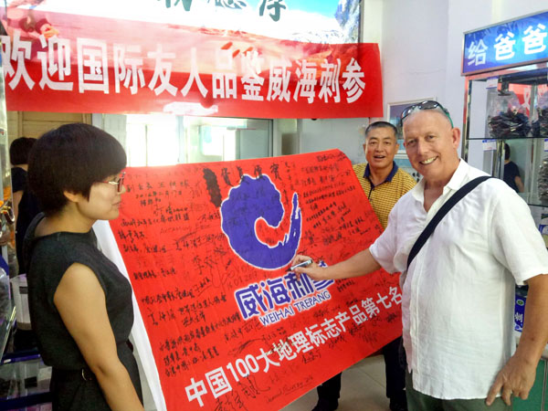 默瑞德先生在威海刺參大旗上簽字,助力威海刺參品牌發(fā)展.。