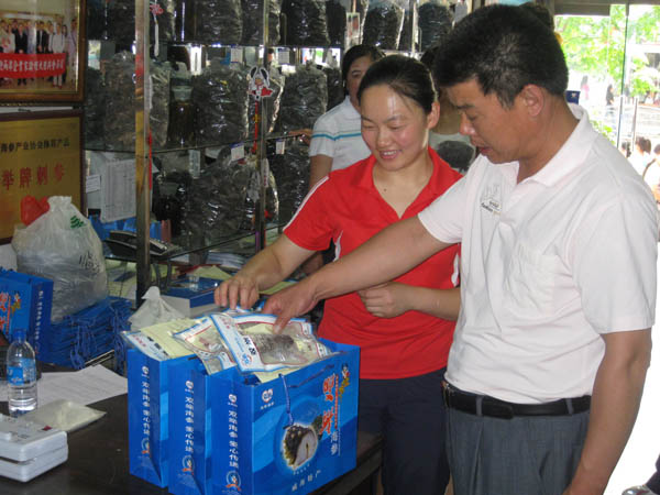 大姨笑了,嘗完海參后,一邊點頭,一邊跟我說到:“嗯,這海參口感真不錯,肉質厚厚的,不過,我要看干海參。”說著,往擺有干參的貨架前走。